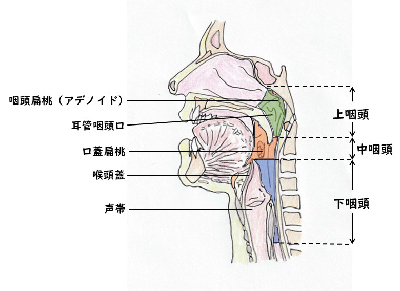 咽頭は場所によって上咽頭・中咽頭・下咽頭と呼ばれています。
